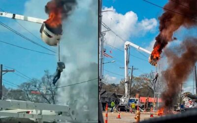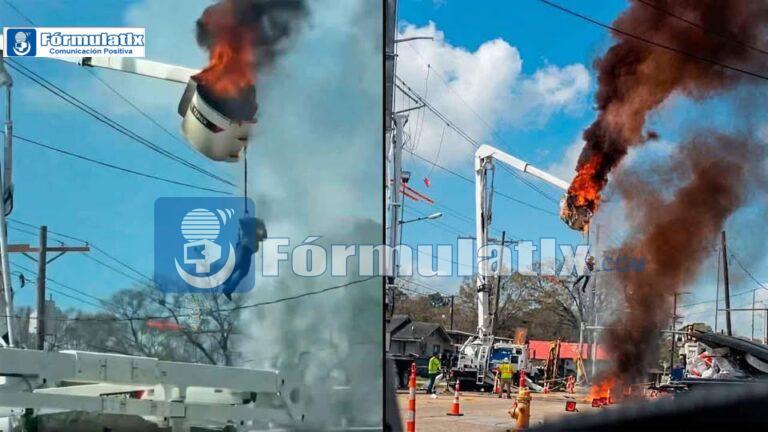 ¡Momento de puro terror en plena vía pública! Un trabajador de servicios públicos quedó colgando desesperadamente de la canasta de un camión elevador mientras esta se incendiaba de repente en Baton Rouge, Louisiana (EE.UU.). El video viral muestra cómo, a varios metros de altura durante labores de mantenimiento, las llamas devoraron el brazo mecánico y…