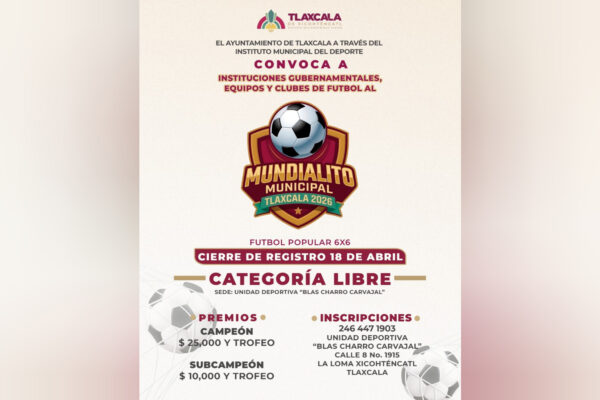 Este sábado 18 de abril concluye el periodo de inscripción para participar en el torneo de futbol popular 6×6 “Mundialito Municipal”, organizado por el Ayuntamiento de Tlaxcala para promover la actividad física, la convivencia social y la participación de jóvenes y ciudadanía en general. A través del Instituto Municipal del Deporte, se…
