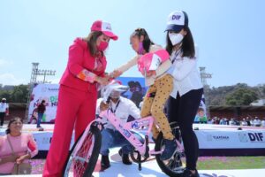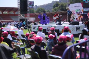 La gobernadora Lorena Cuéllar Cisneros y la presidenta honorífica del Sistema Estatal para el Desarrollo Integral de la Familia (Sedif), Mariana Espinosa de los Monteros Cuéllar encabezaron la celebración del Día del Niño y la Niña en el estadio Tlahuicole.