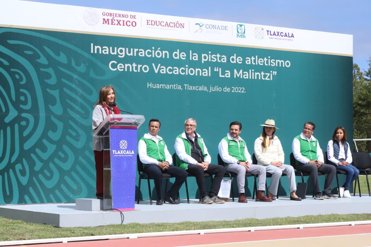 La gobernadora Lorena Cuéllar Cisneros, en conjunto con los directores generales del Instituto Mexicano del Seguro Social (IMSS), Zoé Robledo y de la Comisión Nacional de Cultura Física y Deporte (Conade), Ana Gabriela Guevara Espinoza, inauguraron la pista de atletismo en el Centro Vacacional “La Malintzi”.