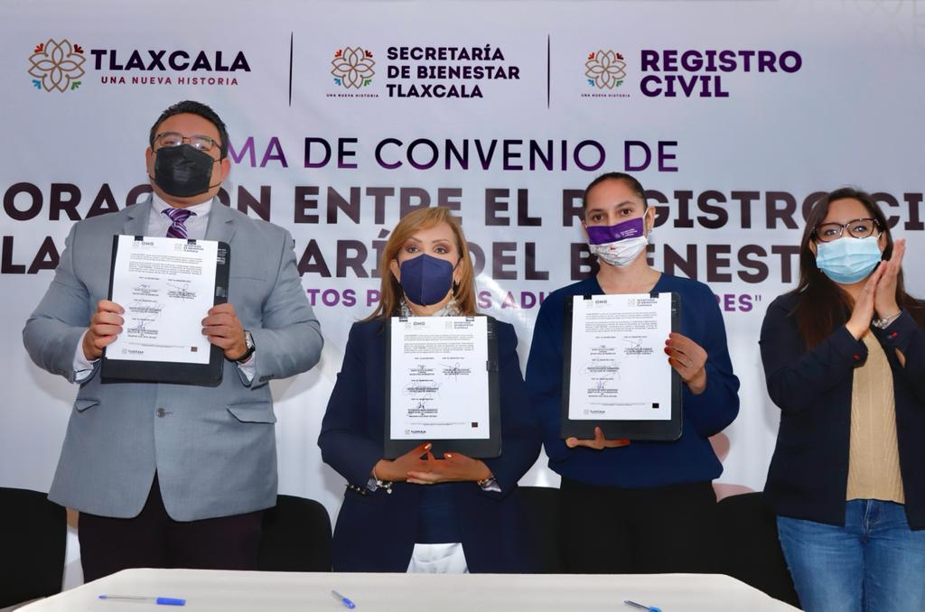 La gobernadora Lorena Cuéllar Cisneros encabezó la firma de convenio entre la Secretaría de Bienestar de Tlaxcala (SBT) y la Coordinación Estatal de Registro Civil, en beneficio de adultos mayores que, por diversas situaciones, no cuenten con su acta de nacimiento, a fin de que no vean limitada su incorporación a los diversos programas sociales que promueve la administración estatal y el gobierno de México.