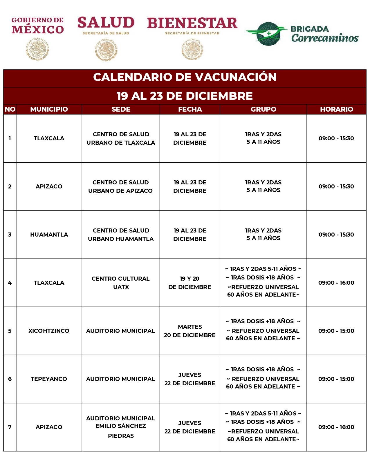 El delegado de la Secretaría de Bienestar Federal en Tlaxcala, Carlos Luna Vázquez informó que, del 19 al 23 de diciembre las Brigadas Correcaminos aplicarán la vacuna Abdala contra Covid 19 a manera de Refuerzo Universal al grupo etario de 60 años en adelante en Apizaco; Tepeyanco; Xicohtzinco y la capital del estado.