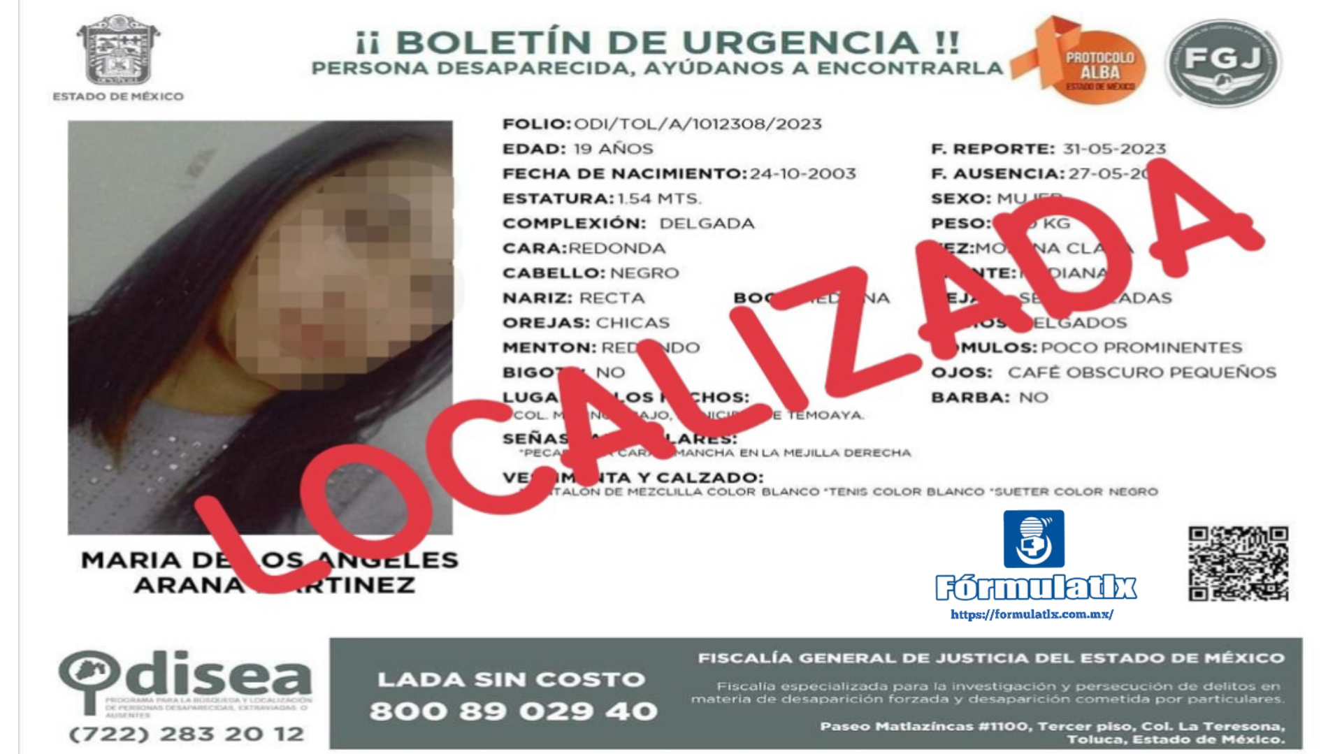 La Fiscalía Especializada en Personas Desaparecidas y No Localizadas (Fepdnl) adscrita a la Procuraduría General de Justicia del Estado (PGJE), en coordinación con la Fiscalía General de Justicia del Estado de México (Fgjem), localizaron a una persona del sexo femenino reportada como desaparecida.