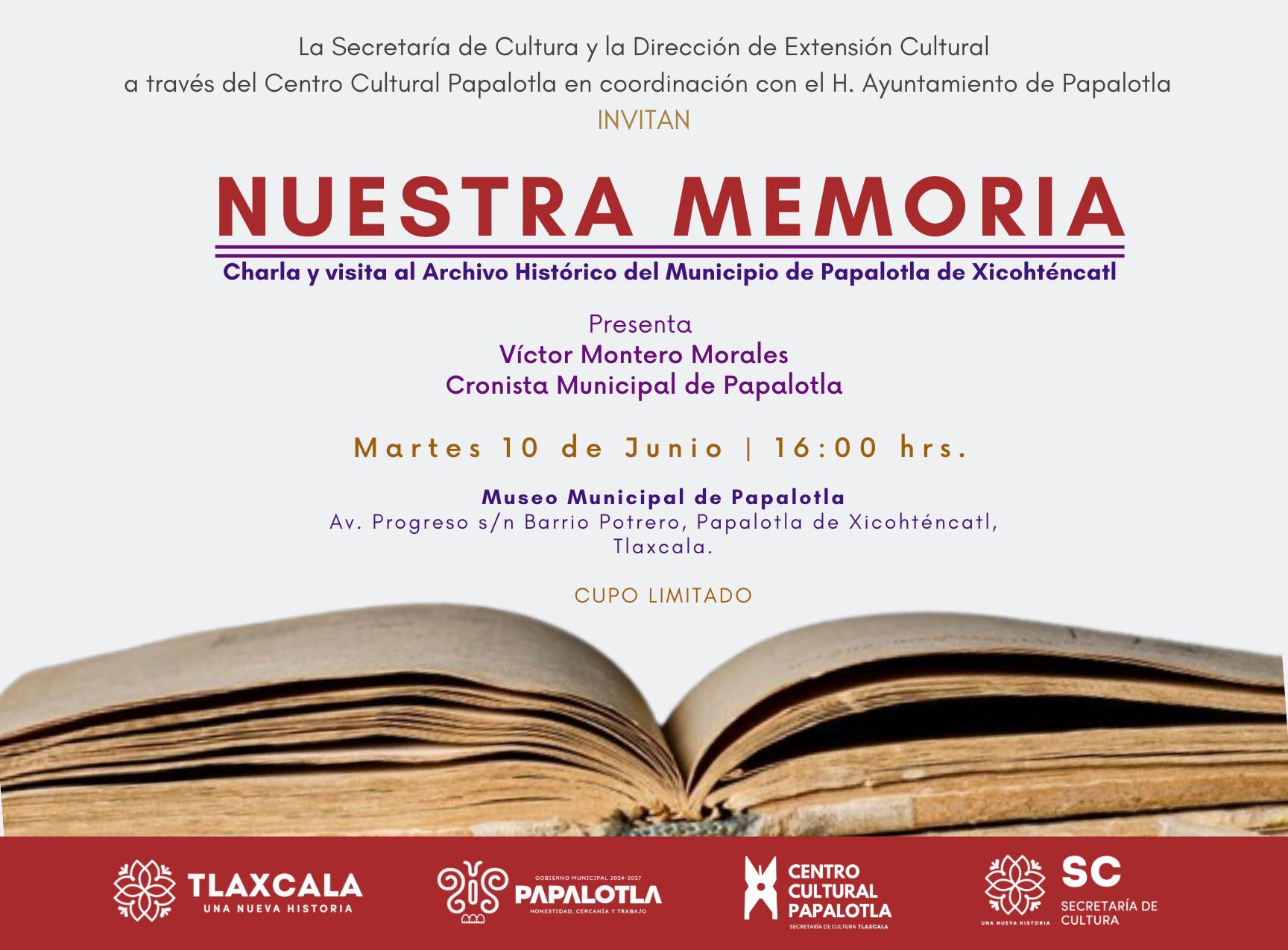 Para dar a conocer los documentos y registros que conforman la memoria colectiva del municipio, el Gobierno Municipal de Papalotla 2025, en colaboración con la Secretaría de Cultura estatal y la Dirección de Extensión Cultural, ha organizado una charla y visita especial al Archivo Histórico del Municipio bajo el nombre «Nuestra Memoria».