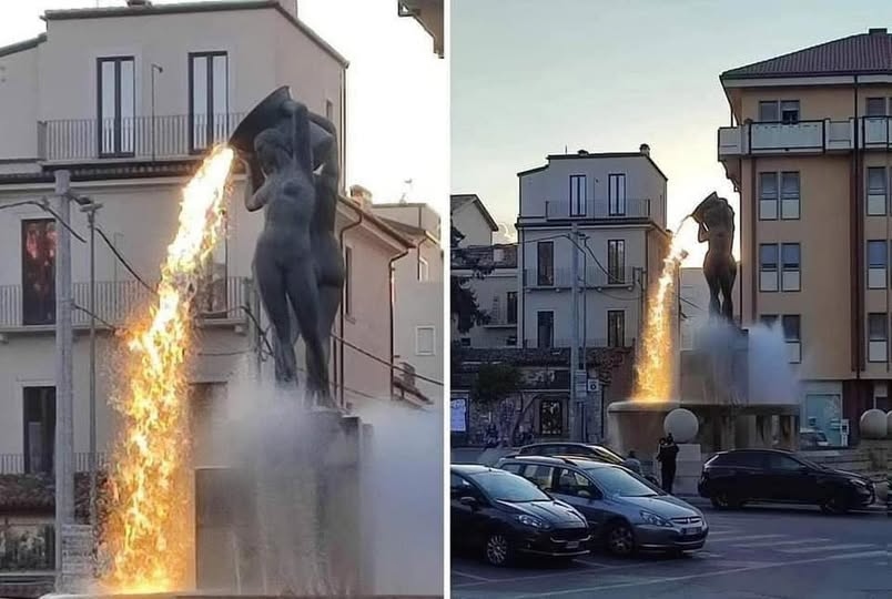 Lo que hace especial a esta fuente es el fenómeno óptico que ocurre durante ciertos atardeceres. Cuando el sol se alinea perfectamente con el chorro de agua que cae de la vasija, su luz dorada se refracta en las gotas y crea un efecto visual sorprendente: parece que las figuras están arrojando fuego o lava incandescente.