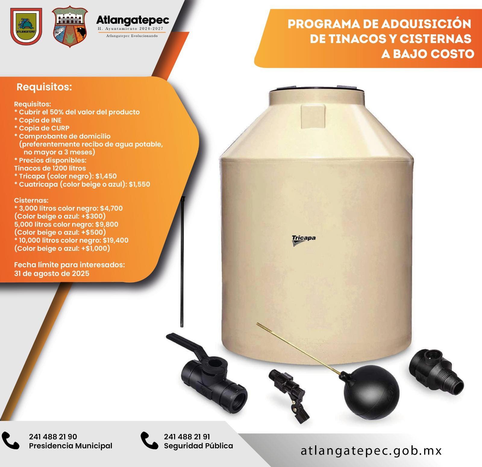 El H. Ayuntamiento de Atlangatepec, a través de la Dirección de Desarrollo Rural y Económico y Desarrollo Social, invita a participar en el Programa de Adquisición de Tinacos y Cisternas a Bajo Costo
