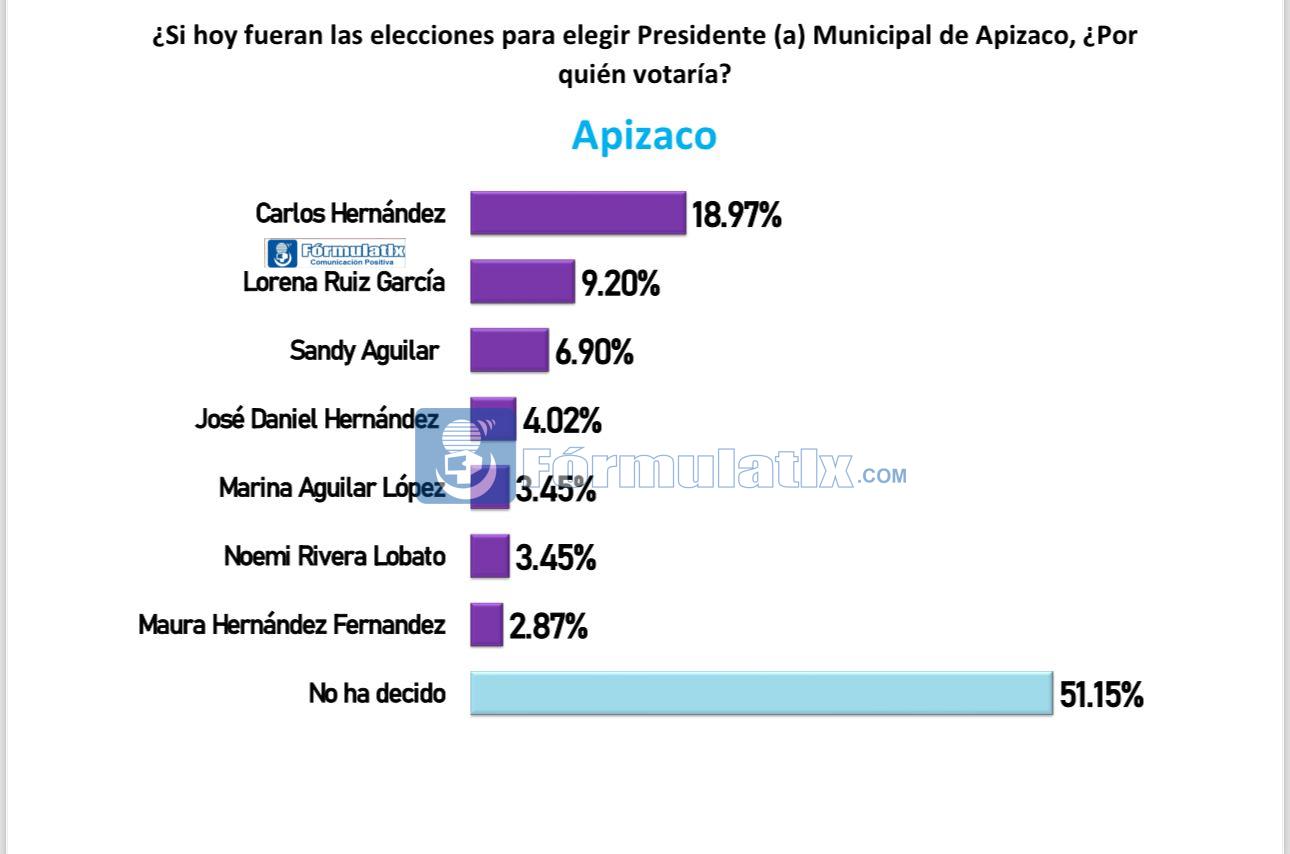 Según el estudio, realizado del 23 al 25 de agosto con 750 entrevistas efectivas, el panista Carlos Hernández encabeza la intención de voto con 18.97%, superando claramente a la morenista Lorena Ruiz García, que apenas alcanza el 9.20%.