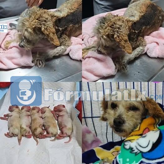 Rescatistas lograron salvarla y tuvo que ser sometida a una cesárea de emergencia: sus cachorritos llegaron al mundo antes de tiempo y, como ella, están luchando por su vida.