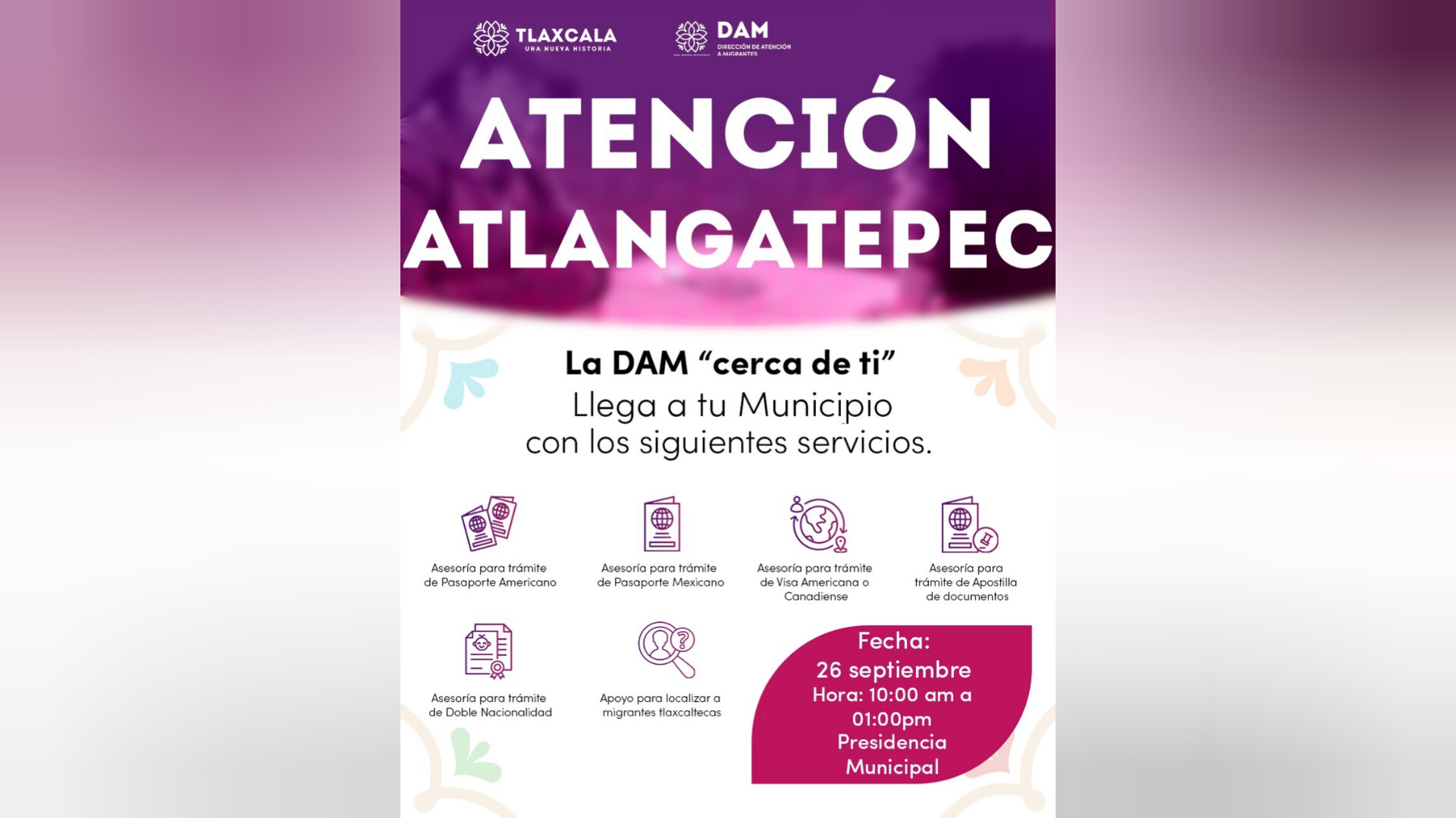 El Municipio de Atlangatepec, en conjunto con la Regiduría de Asuntos Migratorios y con el apoyo de la Dirección de Atención a Migrantes (DAM), invita a toda la comunidad a aprovechar los servicios que estarán disponibles en nuestro municipio.
