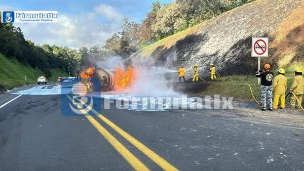 Una pipa que transportaba gasolina volcó y se incendió en la autopista México–Tuxpan, a la altura del kilómetro 135 en Huauchinango.