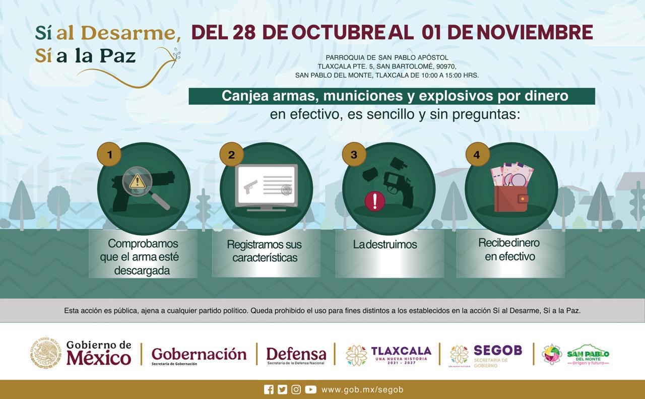 El Gobierno del Estado de Tlaxcala, en coordinación con la Secretaría de Gobernación (Segob), la Secretaría de la Defensa Nacional (Defensa) y el ayuntamiento de San Pablo del Monte, invita a la población a sumarse a la campaña nacional “Sí al Desarme, Sí a la Paz”, que continuará hasta el próximo sábado 1 de noviembre en la Parroquia de San Pablo Apóstol.