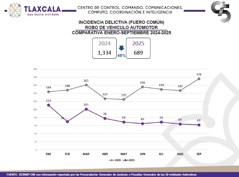 Como resultado de las acciones emprendidas en el marco de la estrategia estatal de seguridad pública, Tlaxcala registró una disminución de 48% en la incidencia de robo de vehículo automotor.
