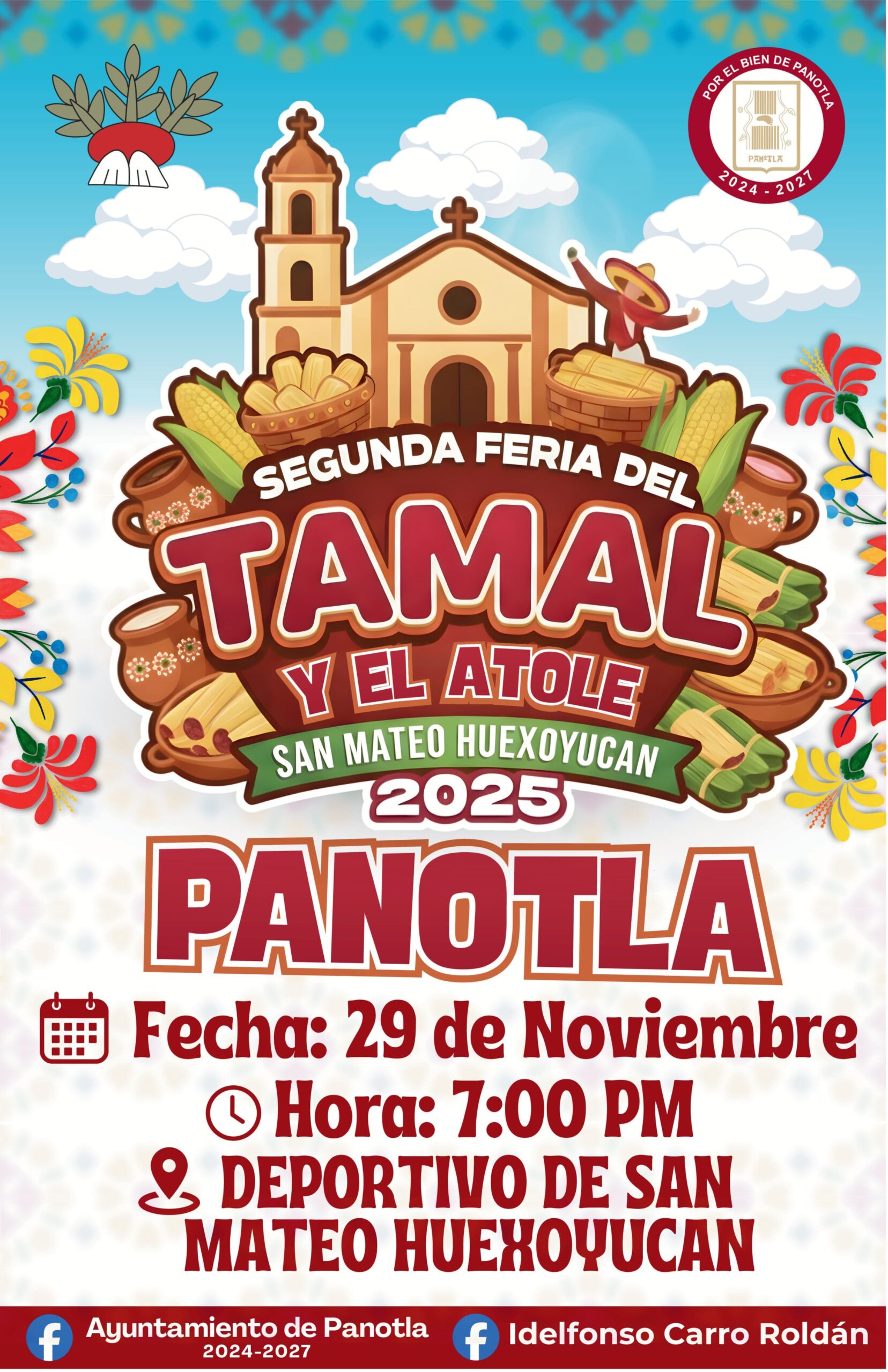 El H. Ayuntamiento de Panotla que encabeza el presidente municipal Idelfonso Carro Roldán, en coordinación con la Presidencia de Comunidad de San Mateo Huexoyucan, dirigida por el C. Arturo Sánchez Maza, invita a la ciudadanía a disfrutar de la Segunda Edición de la Feria del Tamal y el Atole 2025, que se llevará a cabo el sábado 29 de noviembre a partir de las 7:00 p.m. en la cancha deportiva de la comunidad.