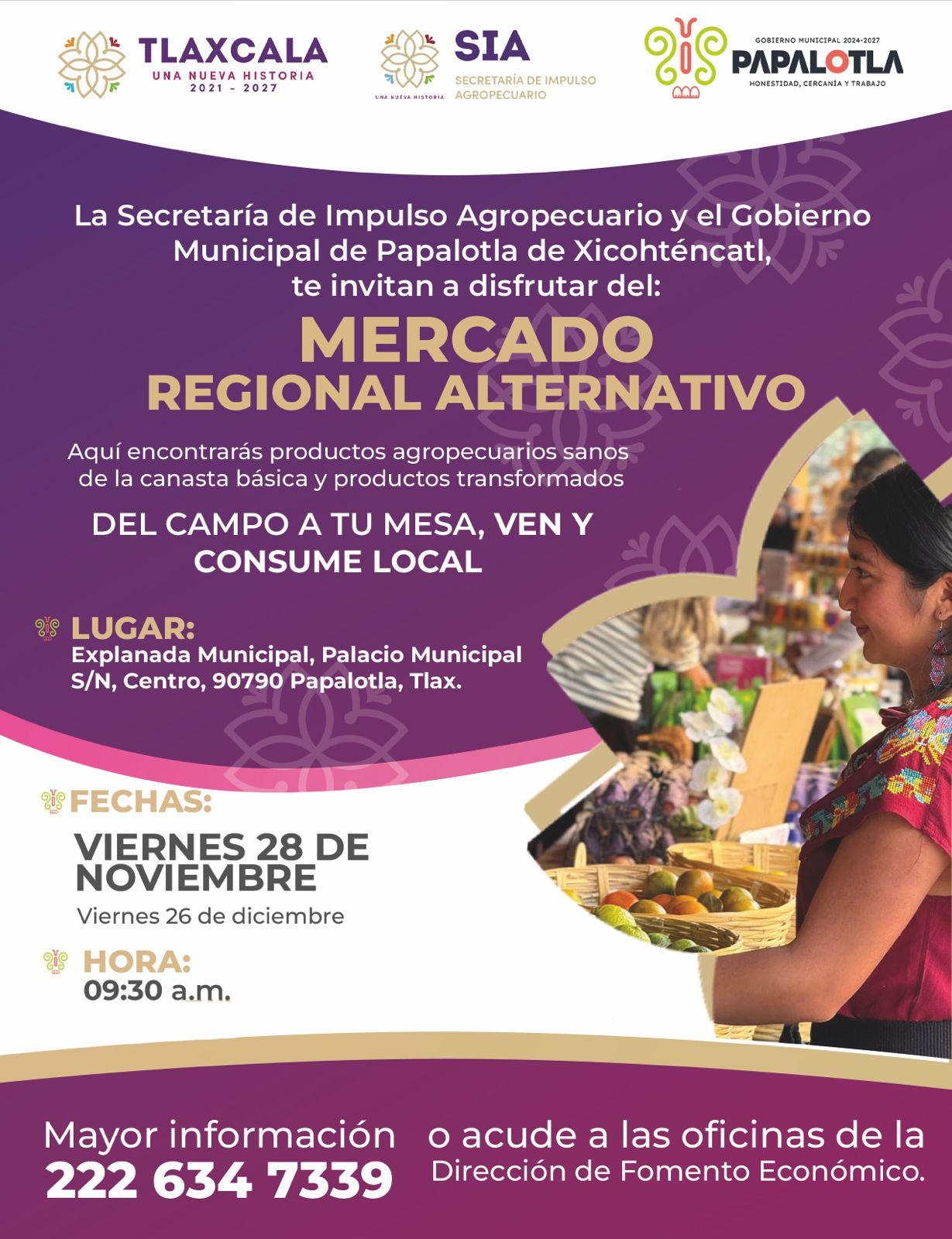 Este mercado alternativo llegará nuevamente a Papalotla el viernes 28 de noviembre y el viernes 26 de diciembre, ambas jornadas a partir de las 09:30 horas en la explanada municipal del Palacio Municipal de Papalotla, ubicado en el centro del municipio.