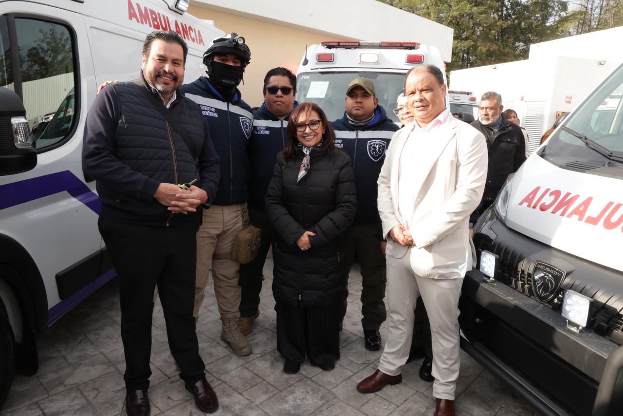 La gobernadora Lorena Cuéllar Cisneros encabezó la entrega de ambulancias a nueve municipios, con una inversión bipartita de 17 millones 910 mil pesos a través del programa “Peso a Peso”, con lo cual se fortalecen la atención prehospitalaria y la capacidad de respuesta para el cuidado de la salud de los tlaxcaltecas, ejes prioritarios de su administración.