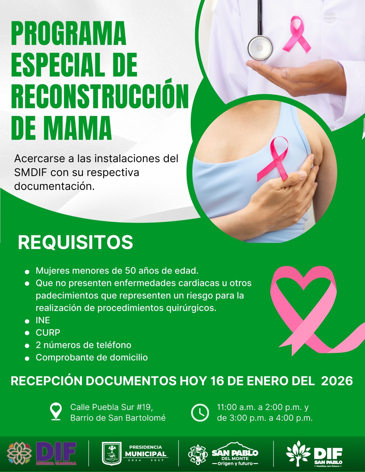 El Sistema Municipal para el Desarrollo Integral de la Familia (SMDIF) de San Pablo del Monte, a través del H. Ayuntamiento, informa a la ciudadanía sobre la implementación del Programa Especial de Reconstrucción de Mama, una acción orientada a mejorar la calidad de vida y el bienestar de las mujeres que han enfrentado esta condición de salud.