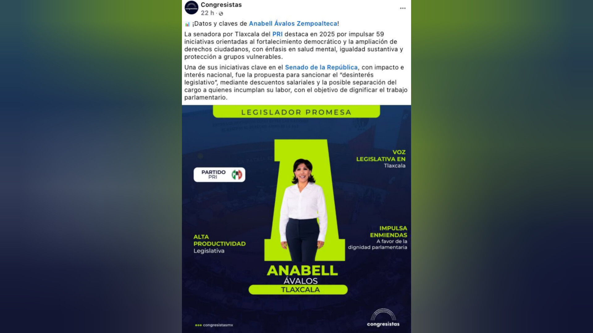 El portal informativo “Congresistas”, medio especializado en el seguimiento de la labor parlamentaria en México, publicó un análisis en el que reconoce el trabajo legislativo de la senadora por Tlaxcala del Partido Revolucionario Institucional (PRI), Anabell Ávalos Zempoalteca, destacándola como una de las figuras con mayor productividad en el Senado de la República durante 2025.