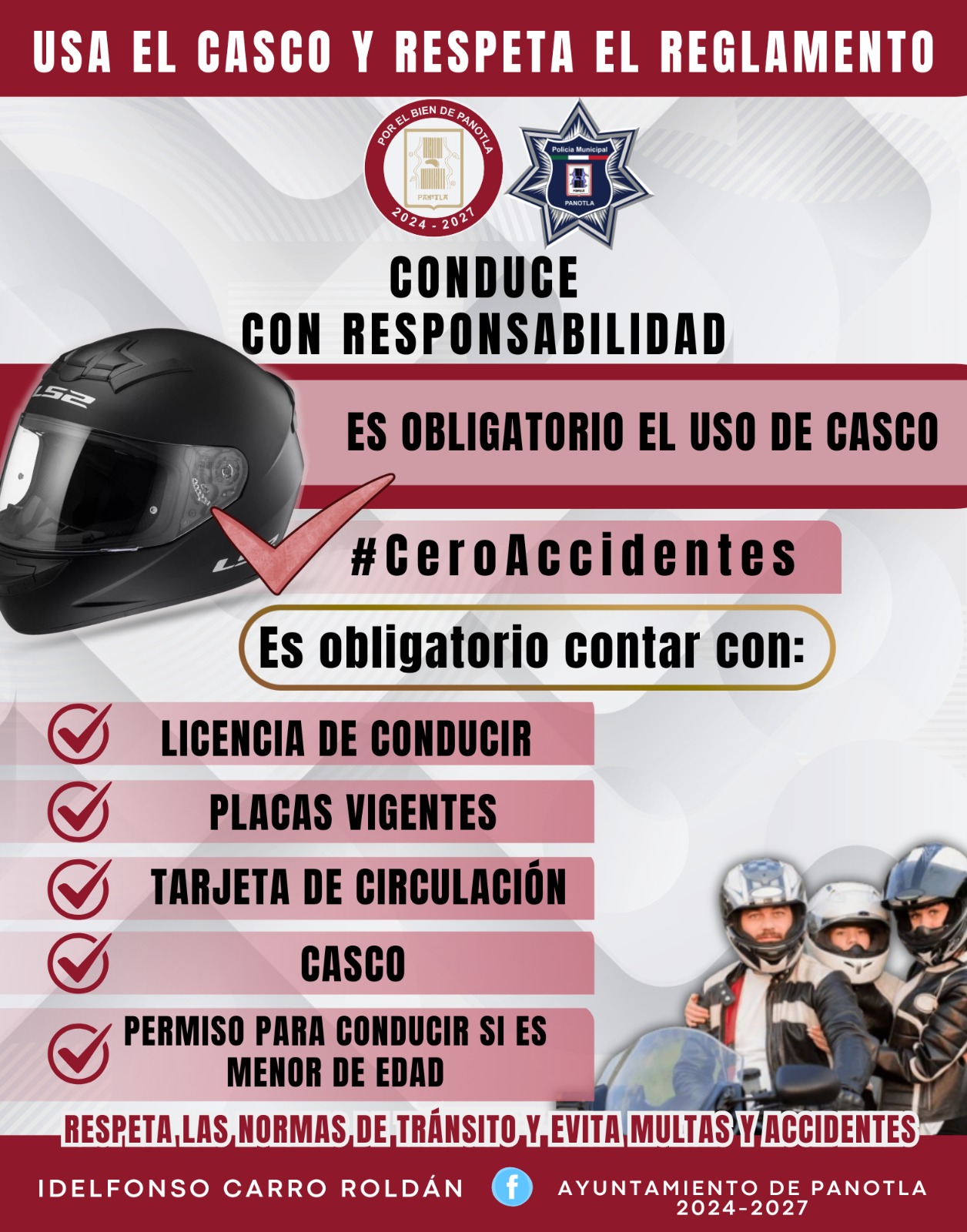 El Ayuntamiento de Panotla, a través de la Dirección de Seguridad Pública Municipal y Vialidad, informa a la ciudadanía que se realizarán de manera continua y permanente revisiones a conductores de motocicleta en distintos puntos del municipio, con el objetivo de fortalecer la seguridad vial y prevenir accidentes.