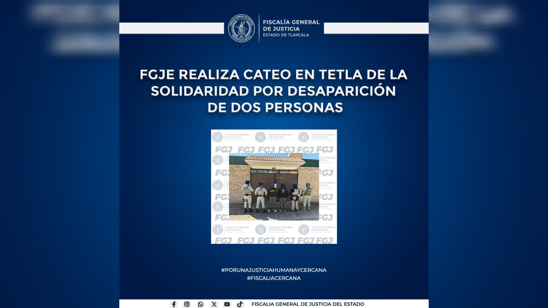 Como parte del seguimiento a una investigación por la desaparición de dos personas, la Fiscalía General de Justicia del Estado (FGJE) cumplimentó una orden de cateo en un domicilio ubicado en el municipio de Tetla de la Solidaridad.