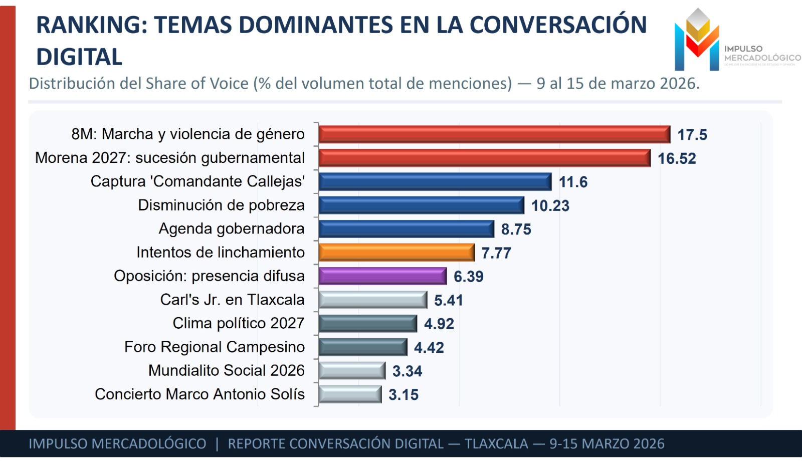 El informe señala que el tema con mayor impacto fue la movilización del 8M, concentrando el 17.5% del total de la conversación digital, con una fuerte carga emocional negativa: indignación y miedo representan el 68% de las reacciones ciudadanas. La exigencia de justicia y resultados en materia de género se consolida como una presión estructural para el gobierno.