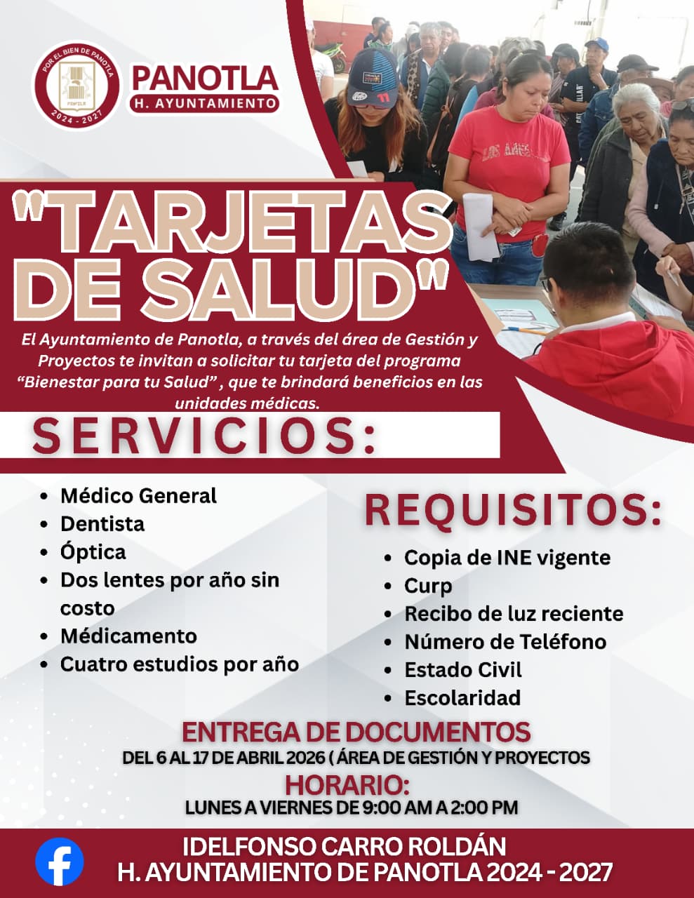 El H. Ayuntamiento de Panotla, encabezado por el presidente municipal Idelfonso Carro Roldán, a través del área de Gestión y Proyectos, invita a la ciudadanía a formar parte del programa “Bienestar para tu Salud”, mediante la solicitud de las “Tarjetas de Salud”, una iniciativa que busca acercar servicios médicos accesibles y de calidad a las familias del municipio.