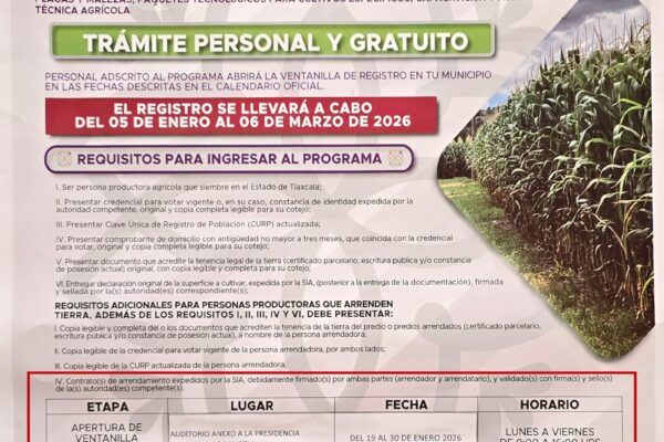 El H. Ayuntamiento de Panotla 2024–2027, que encabeza el presidente municipal Idelfonso Carro Roldán, informa y respalda la difusión del Programa de Apoyo e Impulso al Sector Agrícola (PAISA 2026), impulsado por el Gobierno del Estado de Tlaxcala a través de la Secretaría de Impulso Agropecuario (SIA), con el objetivo de fortalecer la actividad…