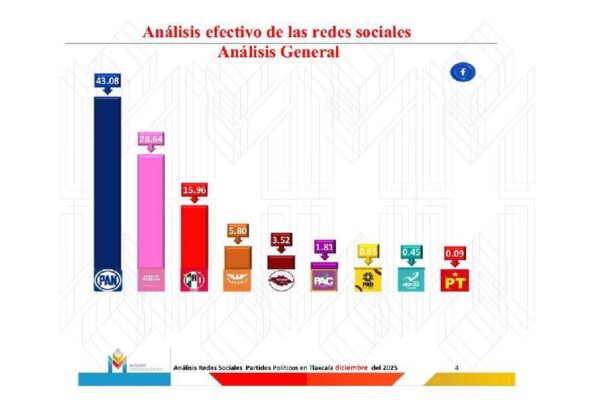 TLAXCALA, Tlax., 5 de enero de 2026.– El Partido Acción Nacional (PAN) se consolidó al cierre de 2025 como la fuerza opositora más activa y efectiva en redes sociales en Tlaxcala, de acuerdo con el más reciente Análisis Digital de Redes Sociales de la empresa Impulso Mercadológico, correspondiente a diciembre de 2025.  …